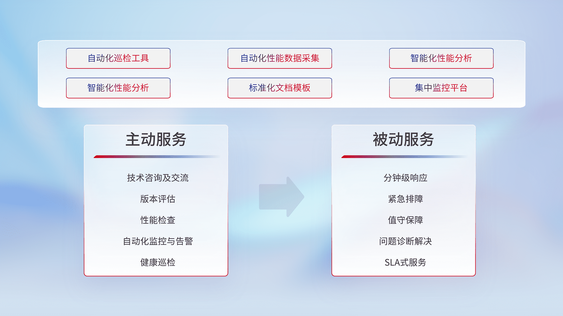 智能化工具和标准化文档,,,,保障服务质量,,,提供主动服务(包含技术咨询、、版本评估、、性能检查、、、、自动化监控与告警、、、、健康巡检)和被动服务包含(分钟级响应、、、、紧急排障、、、、值守保障、、、问题诊断解决、、SLA服务)。。。